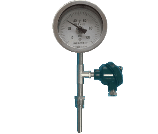 双金属温带热电偶、热电阻一体化温度计和双金属带热电偶、热电阻一体化温度变送器是现场就地显示和远传电信号的温度传感器,它可以就地指示温度,也可以同时把信号远传至控制仪表,以实现远程调节和控制,上海自动化仪表三厂生产的WSSP-381可动外螺纹万向一体化双金属温度计,作为新一代的温度传感器,它可以直接测量工业生产过程中-60℃~500℃范围内的液体、气体和蒸汽等介质的温度,被广泛用于冶金、石化、电力、轻纺、食品国防等工业部门。